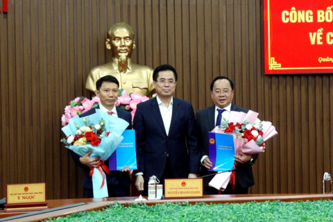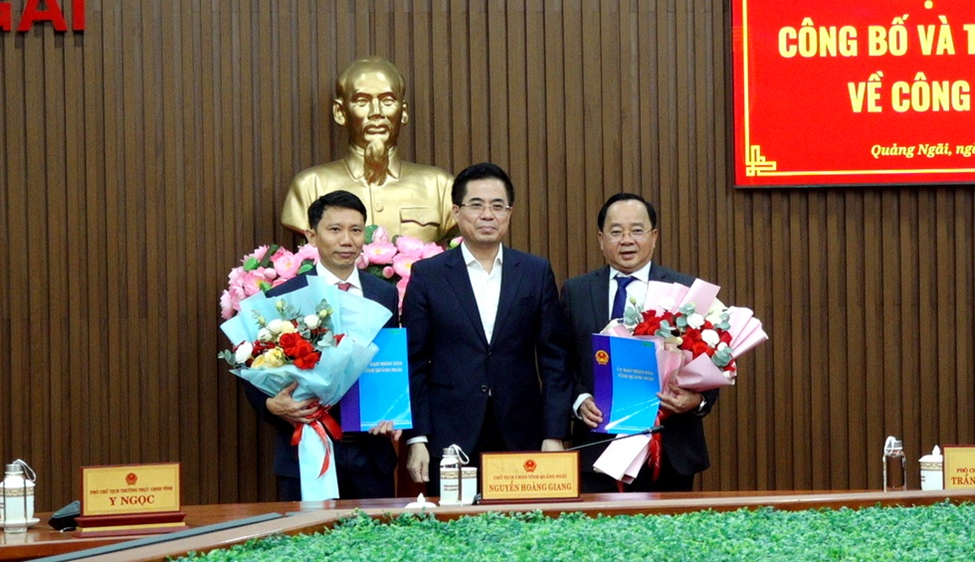 Chủ tịch UBND tỉnh Nguyễn Hoàng Giang trao Quyết định và tặng hoa chúc mừng các đồng chí nhận nhiệm vụ mới